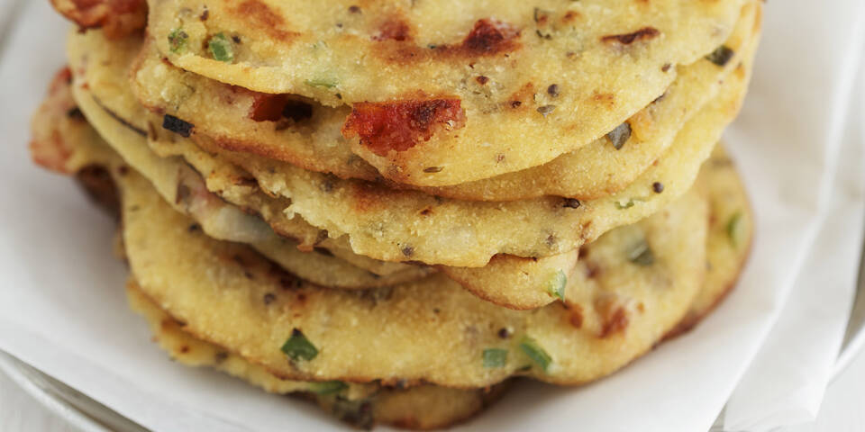 - Etwas Öl in einer beschichteten Pfanne erhitzen. 1–2 EL Teig hineingeben und unter Wenden kleine Laibchen von ca. 12 cm Durchmesser ausbacken. Bereits gebackene Laibchen im Ofen bei ca. 60 °C warm halten. Dazu passt ein erfrischender Joghurt-Dip.