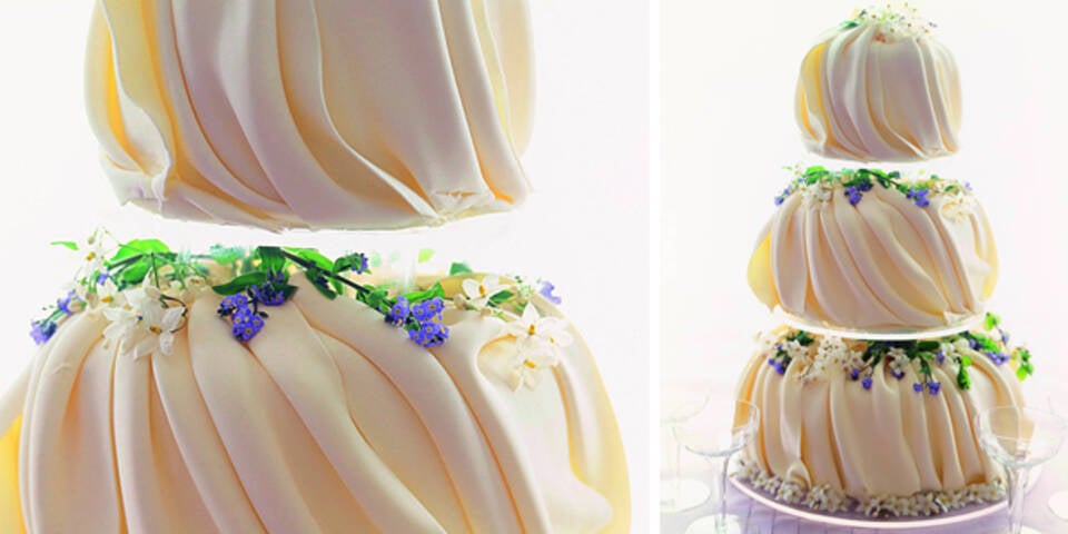5. Die beiden anderen Gugelhupfe ebenso in Rollfondant hüllen, dabei für den mittleren Gugelhupf 2 Portionen und für den großen Kuchen 3 Portionen Rollfondant verwenden. Die Kuchen auf der Etagere platzieren, die Mittelsäule jeweils durch das Mittelloch der Gugelhupfe einschieben und in der unteren Etage fixieren. Zuletzt den kleinen Kuchen ganz oben platzieren. Alle Torten nach Belieben mit den Blüten belegen und dekorieren.