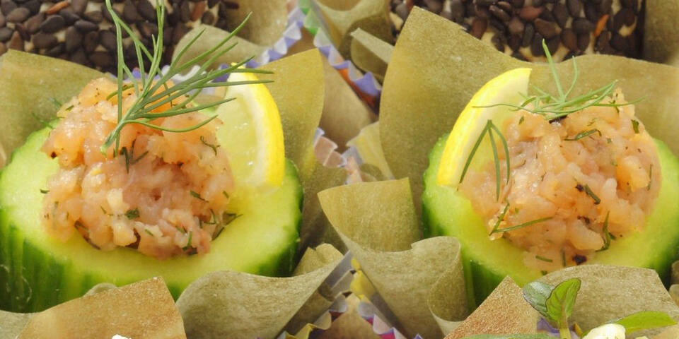 Den Lachs waschen, trocken tupfen, in kleine Würfel schneiden und hacken. Die Schalotte abziehen, ebenfalls fein hacken und mit Dill, Öl und Zitronensaft unter den Lachs mischen. Mit Salz und Pfeffer abschmecken. Die Gurke waschen, in 4 cm lange Stücke schneiden, mit einem Kugelausstecher die Kerne herauslösen und die Gurkenstückchen mit dem Lachstatar befüllen. Mit Zitronenecken und Dillspitzen garnieren.