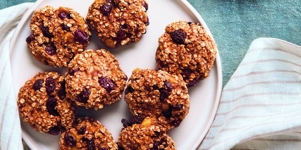 1. In einer großen Schüssel zerdrückte Bananen und Haferflocken vermengen, dann die Rosinen unterziehen.