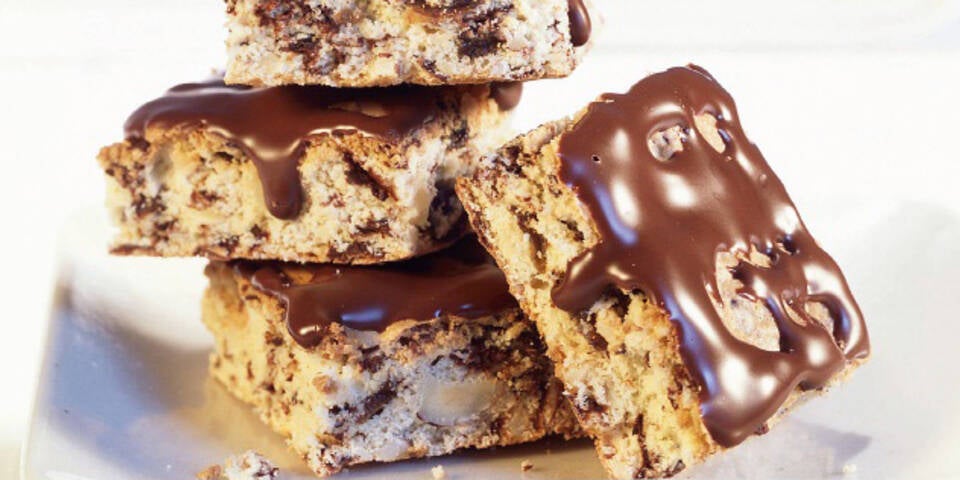 - Backblech einfetten und die Masse darauf streichen. Ca. 35 Minuten backen und noch heiß vorsichtig in Streifen schneiden. Abkühlen lassen.