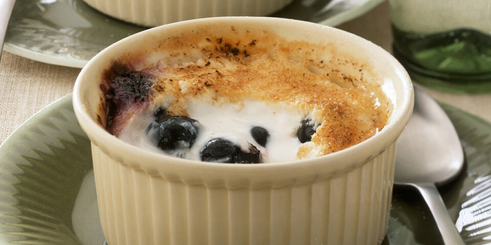 - Obers in einem Eisbad kalt rühren. Wenn das Obers anfängt zu gelieren, das Joghurt unterheben. Die Heidelbeeren abbrausen, gut trocken tupfen und auf vier hitzebeständige Förmchen verteilen. Für ca. 4 Stunden in den Kühlschrank stellen.
