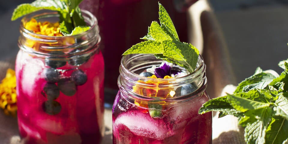 - Etwa 10 Minuten ziehen lassen, dann 400 ml kaltes Wasser dazugießen. Im Kühlschrank mindestens 2 Stunden vollständig erkalten lassen. Den Tee durch ein Sieb gießen und den Heidelbeersirup einrühren. Die übrigen Beeren und die Eiswürfel ergänzen und auf Gläser verteilen. Mit übriger Minze und Blüten garniert servieren.