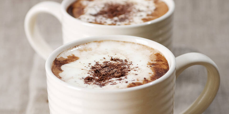 - Währenddessen das Obers mit Zimt und Zucker halb steif schlagen. Die heiße Schokolade in Tassen füllen, darauf das Obers geben und mit übriger Schokolade bestreut rasch servieren.