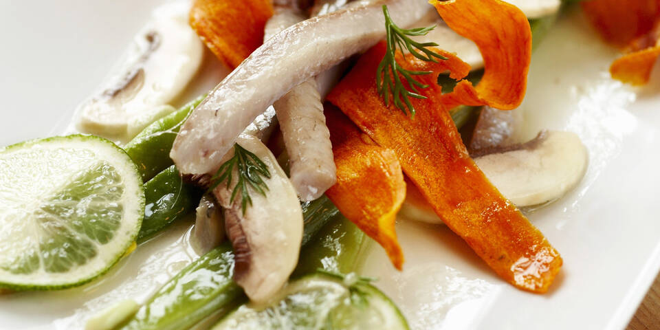 - Zusammen mit den Fisolen in heißem Öl schwenken und mit dem Limettensaft beträufeln. Mit Salz, Pfeffer sowie Zucker abschmecken, vom Feuer nehmen, lauwarm abkühlen lassen und anschließend mit den Karotten auf Tellern anrichten.