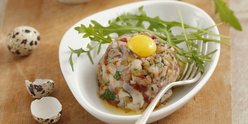 - Die Eier aufschlagen und trennen. Jeweils 1 Eigelb auf das Tatar setzen (Eiklar anderweitig verwenden) und mit geputztem Rucola garniert servieren.