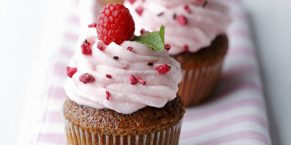 - Für die Creme Butter mit Zucker cremig verrühren, Frischkäse und Sirup unterrühren. Nun so viel Staubzucker unterrühren, bis eine spritzfähige Masse entstanden ist. In einen Spritzbeutel mit gezackter Tülle füllen und auf die Cupcakes spritzen. Die getrockneten Himbeeren zerbröseln und auf die Creme streuen. Je eine Himbeere und etwas Minze daraufsetzen.