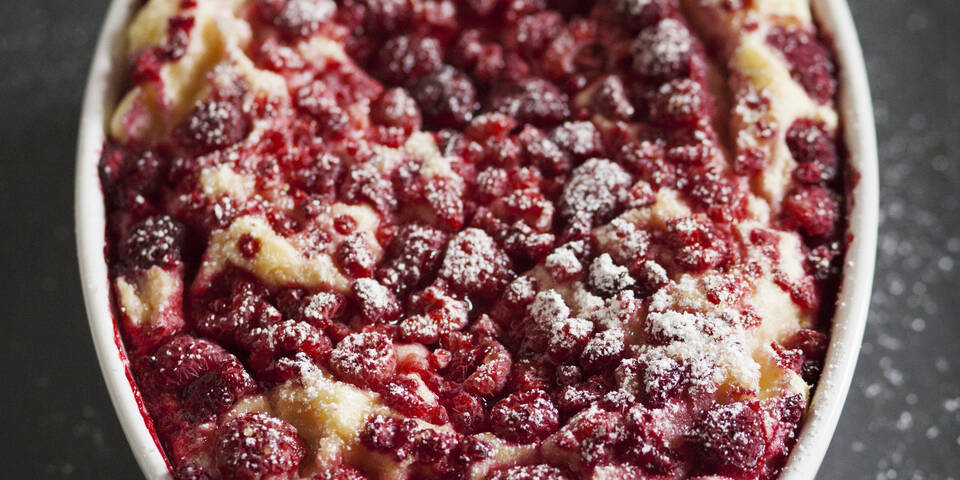 - Die Masse in eine gebutterte Auflaufform füllen. Die Himbeeren darauf verteilen und im Ofen bei 200 °C ca. 30 Minuten goldbraun backen. Vor dem servieren mit Puderzucker bestauben.