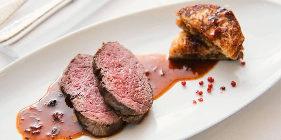 - Rosmarinzweige und Wacholder in eine Pfanne geben und gemeinsam mit dem Hirsch stark von jeder Seite anbraten. Danach mit den Zweigen und einem Esslöffel Butter in Alufolie geben, bei 110°C ca. 25–30 min garen. Danach rausnehmen, rasten lassen. Zu dem Bratenrückstand Zucker, Preiselbeeren, Gewürze zugeben und reduzieren lassen. Anschließend pürieren.