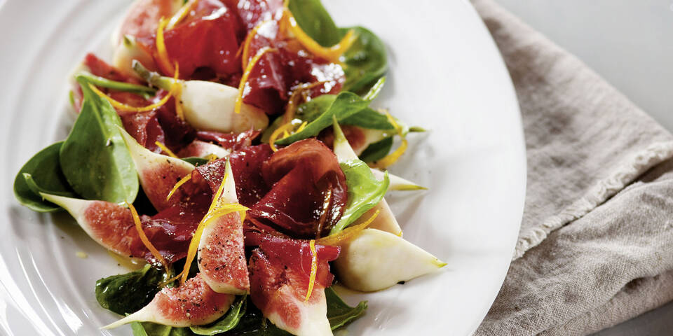 - Blattsalate und Feigen zur Vinaigrette in die Schüssel geben und locker miteinander mischen, dann auf einer großen Platte verteilen. Hirschschinken darauflegen, alles mit der restlichen Vinaigrette beträufelt servieren.
