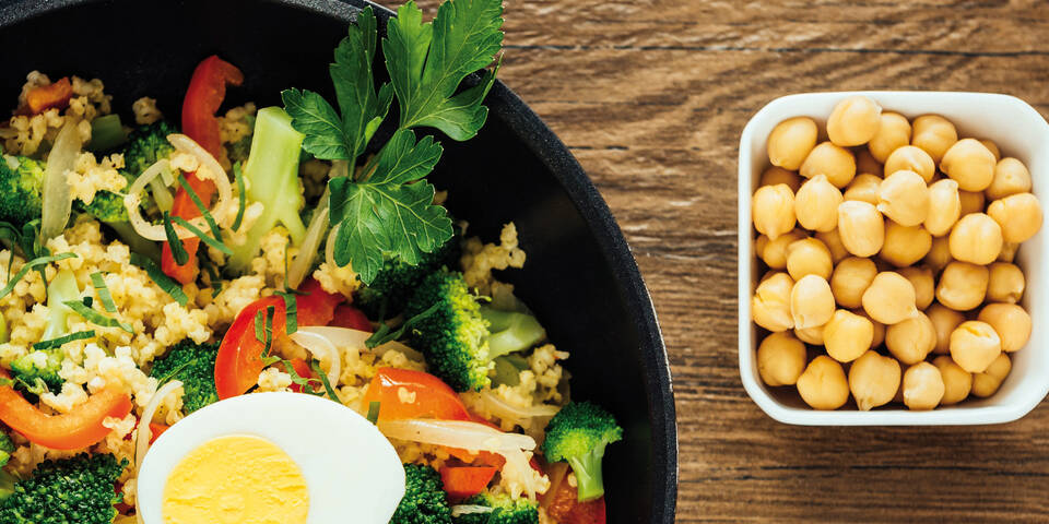 - Brokkoli in Röschen teilen und bissfest dämpfen. Zwiebel- und Paprikawürfel in Öl andünsten, Brokkoliröschen und gekochte Hirse untermischen, salzen, pfeffern, gehackte Petersilie unterheben. Mit Kichererbsen anrichten.