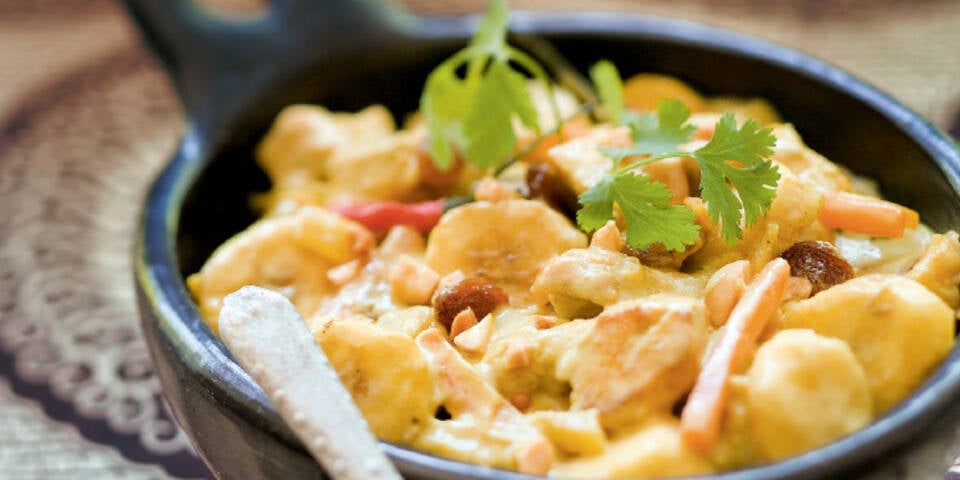 - Garam Masala kurz mitschwitzen, dann mit dem Fond ablöschen. Das Huhn, die Rosinen und die Bananen ergänzen und alles zusammen etwa zehn Minuten gar köcheln. Das Joghurt zum Schluss mit den zerstoßenen Erdnüssen unter das Curry mengen. Heiß werden, aber nicht mehr kochen lassen. Mit Salz und Zitronensaft abschmecken und servieren. Dazu nach Belieben Reis reichen.