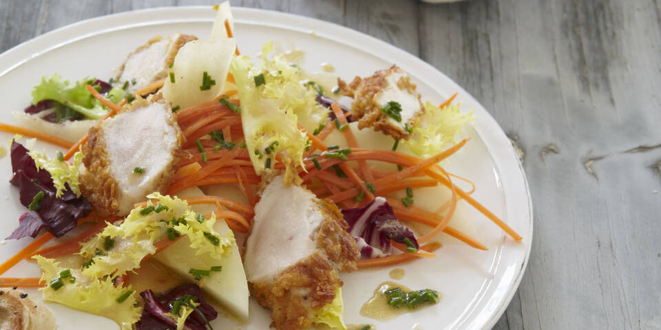 - In heißem Fett unter Wenden sechs Minuten knusprig ausbacken. Den Blattsalat mit Karotten und Kohlrabi auf flachen Tellern anrichten. Das fertig gegarte Huhn aus der Pfanne nehmen und in breite Streifen aufschneiden. Auf dem Salatbett anrichten und mit dem Dressing beträufeln.