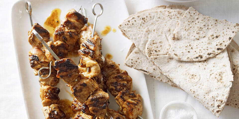 - Das Hühnerfleisch aus der Marinade nehmen und auf lange Grillspieße stecken. Auf dem heißen Grill unter regelmäßigem Wenden acht Minuten grillen. Zwischendurch ab und zu mit der Marinade bepinseln.