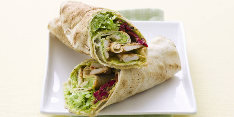 - Die Tortillas in einer trockenen Pfanne erhitzen. Mit der Avocadocreme bestreichen. Die Hühnerbrustfilets in Streifen schneiden und mit den roten Rüben und dem Salat auf die Tortillafladen verteilen. Zu Wraps einrollen und schräg halbiert servieren.