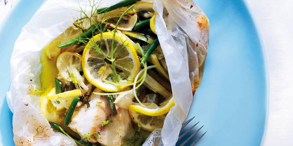 - Den Fisch abbrausen, trocken tupfen und jeweils auf die Mitte von vier zurechtgeschnittenen Stücken Backpapier (ca. 30 x 30 cm) legen. Das Gemüse, den Knoblauch und den abgezupften Dill darauf verteilen. Mit den Zitrusfruchtscheiben belegen. Alles mit Salz und Pfeffer übermahlen sowie mit je 1 EL Olivenöl beträufeln.