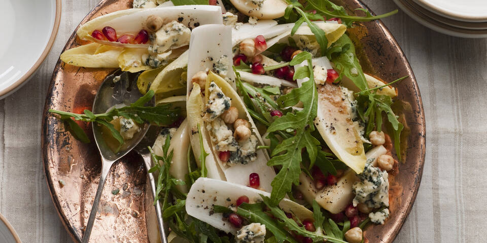 - Die Haselnüsse in iener heißen Pfanne rösten. Herausnehmen und abkühlen lassen. Den Chicorée und den Rucola waschen, putzen, zerteilen und trocken schleudern.