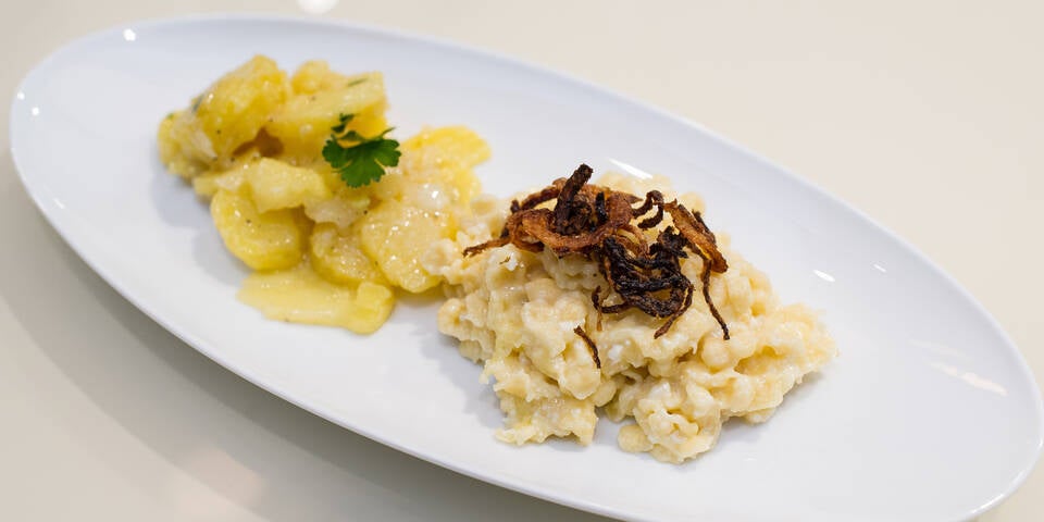 - Lagenweise mit dem geriebenen Käse in eine ofenfeste Form geben. Das Ganze kurz in den vorgeheizten Ofen geben. Mit Röstzwiebeln und Erdäpfelsalat genießen.