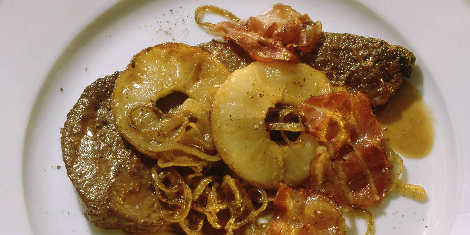 - Die gebratene Kalbsleber erst jetzt salzen und mit den glacierten Apfelringen, dem Speck und der Sauce anrichten.