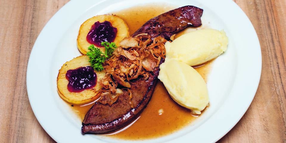 3. Leber auf heißen Tellern anrichten, Sauce durch ein feines Sieb darüberziehen. Filets längs mit je 1 Streifen Röstzwiebeln belegen und Apfelscheiben an die Filets legen. In die Mitte der Apfelscheiben je 1 TL Preiselbeeren setzen.