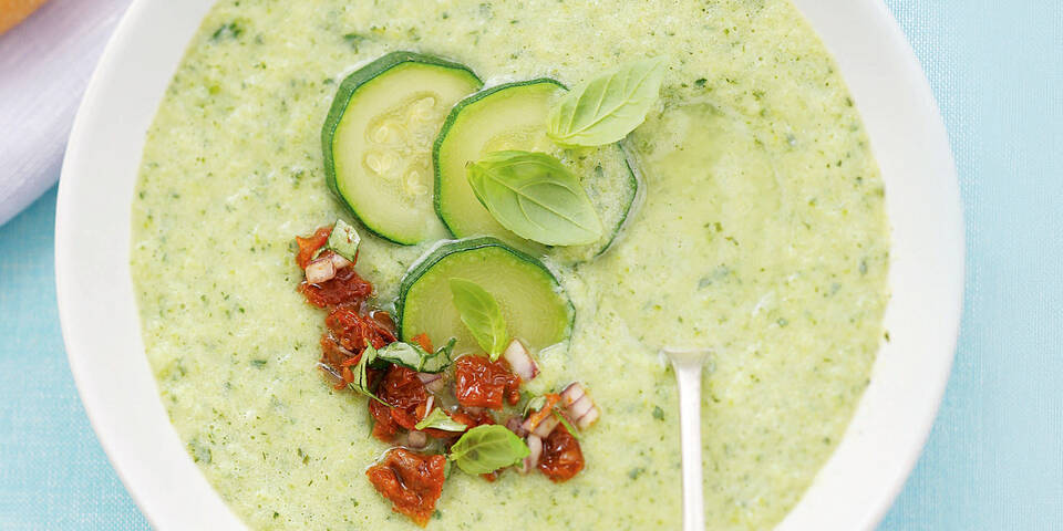 - Die Zucchini waschen, putzen, in Scheiben schneiden und kurz in heißem Salzwasser blanchieren. Abgießen, kalt abschrecken und gut abtropfen lassen. Einige Scheibe für die Garnitur beiseitelegen und den Rest klein schneiden. Den Knoblauch abziehen und hacken. Die Gurke schälen, längs halbieren, entkernen und in kleine Würfel schneiden. Das Basilikum abbrausen, trocken schütteln, die Blättchen abzupfen und einige beiseitelegen. Den Rest mit den Gurkenwürfeln, der Zucchini und dem Knoblauch in einem hohen Gefäß pürieren und so viel Fond angießen, bis die gewünschte Konsistenz erreicht ist.