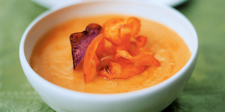 - Buttermilch unterrühren und die Suppe pürieren. Mit Salz und Pfeffer abschmecken. Suppe in vorgewärmte Schälchen füllen und mit den Gemüsechips angerichtet servieren.