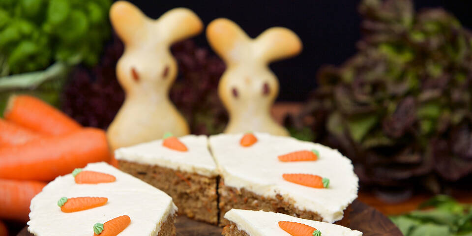 1. Backofen auf 180 °C Ober-und Unterhitze vorheizen. Zwei Springformen (ca. 18 cm ø) mit Backpapier auslegen. Karotten schälen und fein raspeln. Eier trennen. Eigelb mit dem Zucker schaumig schlagen, dann den Orangenabrieb zufügen. Mehl und Backpulver vermengen, auf die Eigelbmasse sieben und unterziehen.