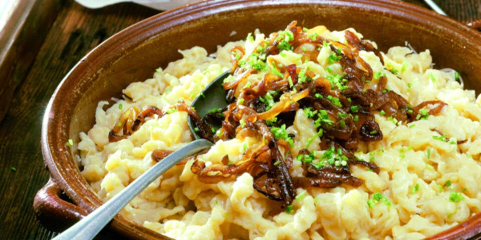 5. Die Zwiebeln in Ringe schneiden und im Butterschmalz goldbraun rösten. Die Käsespätzle damit bestreuen und mit Schnittlauchröllchen servieren.