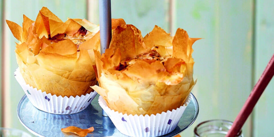 1. Ein Muffinbackblech mit Papierförmchen ausstellen. Den Filoteig in Quadrate (à ca. 12 x 12 cm) schneiden. Jedes Blatt mit Butter bepinseln und versetzt in 4–5 Schichten die Förmchen damit auslegen. Den Backofen auf 180 °C Umluft vorheizen.