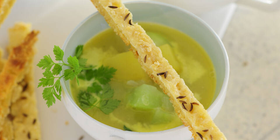 - Die Kohlrabi rundherum schälen und klein würfeln. Die Erdäpfel ebenfalls schälen, waschen und in Würfel schneiden. Die Zwiebel schälen, klein hacken und in einem Topf mit zerlassener Butter andünsten. Kohlrabi und Erdäpfel zufügen und kurz mitschwitzen. Den Fond angießen und aufkochen lassen. Mit Salz und Pfeffer würzen und zugedeckt ca. 20 Minuten köcheln lassen.