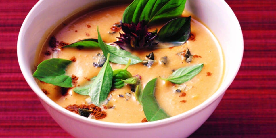 3. Das Thaibasilikum waschen, trocken schütteln, die Blätter abzupfen und die Hälfte fein hacken. Die gehackten Blätter unter die Suppe rühren und diese in vorgewärmten Schälchen anrichten. Mit Kürbiskernen bestreuen und mit den restlichen Basilikumblättern garniert servieren.