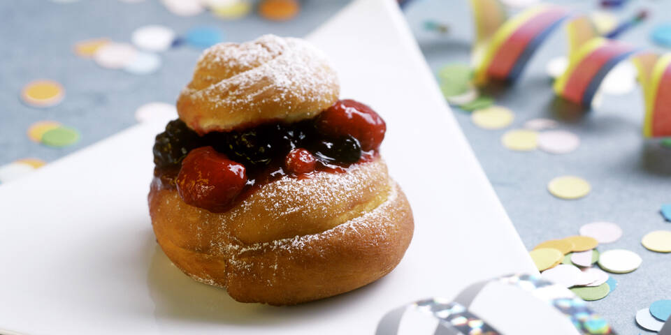 - Für die Beerenfüllung den Wein mit dem Zucker, Vanillezucker und 75 ml Wasser aufkochen und den Zucker auflösen lassen. Die Speisestärke mit 1 EL Wasser glatt rühren, danach in die Flüssigkeit einrühren, kurz aufkochen und binden lassen. Vom Herd ziehen und in eine Schale umfüllen. Die Beeren in die Flüssigkeit legen und abkühlen lassen. Zum Servieren einen Deckel abschneiden, je 1–2 EL der Beerenfüllung aufgeben, den Deckel locker wieder aufsetzen und mit Staubzucker bestauben.