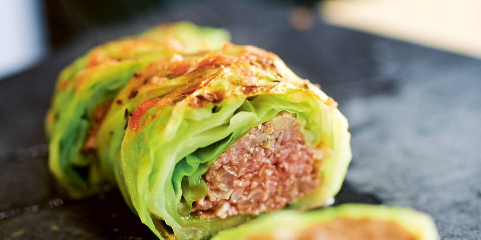 - Die abgekühlte Zwiebel-Kraut-Mischung unter die Fleischmasse aus dem Kühlschrank kneten. In 8 Portionen teilen und mittig auf die vorbereiteten Blätter geben. Die Seiten einschlagen und die Krautrouladen aufrollen. Den Backofen auf 170 Grad vorheizen.