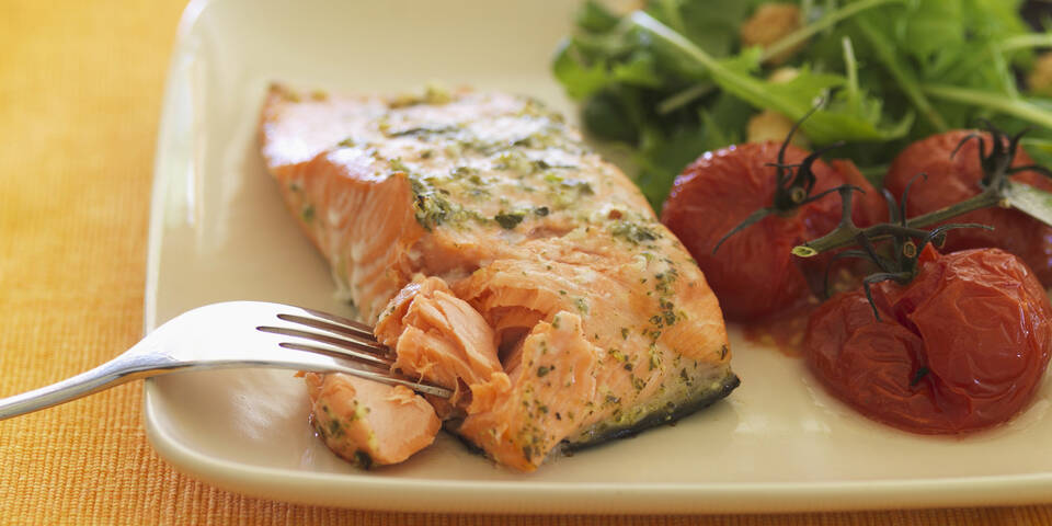 - Lachsfilets aus dem Backrohr nehmen, aus der Folie heben, mit Salz und Pfeffer würzen und mit den mitgeschmorten Paradeisern und Basilikum anrichten. Vor dem Servieren mit einigen Tropen Olivenöl und Zitronensaft beträufeln.