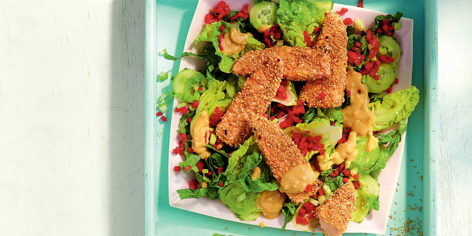 - Die Lachsfinger in der Sesampanade wälzen. Das Olivenöl in einer beschichteten Pfanne erhitzen. Die Lachsstreifen hineinlegen und bei mittlerer Temperatur von jeder Seite 1–2 Minuten braten. Etwas abkühlen lassen und auf dem Salatbukett anrichten. Das Dressing darüberträufeln.