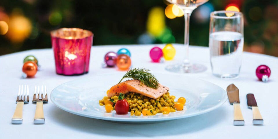 - Die Lachsforellen auf der Hautseite in etwas Öl ca. 3 Minuten scharf anbraten. Filets wenden und die Pfanne von der Hitze nehmen. 3–4 Minuten ziehen lassen – mit Salz und Pfeffer aus der Mühle würzen. Lachsforelle auf Tarhonya anrichten und nach Belieben mit Dill garnieren.