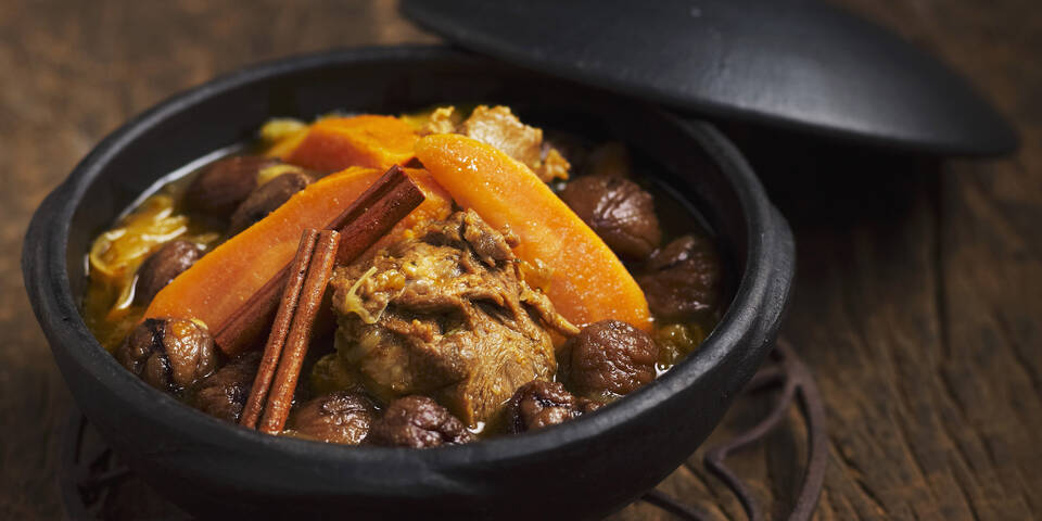 - Die Süßkartoffeln schälen und in Spalten schneiden. Die Zitrone heiß waschen und trocken tupfen. Die Schale abreiben und etwas Saft auspressen. Die abgeriebene Zitronenschale mit dem Zimt und den Süßkartoffeln während der letzten ca. 45 Minuten mit zum Lamm geben. Die Maroni während der letzten ca. 20 Minuten mitgaren und nach Bedarf Fond nachgießen.