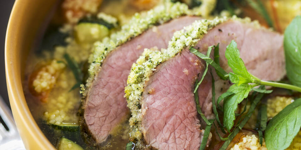 1. Die Lammkeule von überschüssiger Silberhaut, Fett und Sehnen befreien. Danach von allen Seiten dünn mit Olivenöl einreiben und mit grobem Meersalz würzen. Abgedeckt ca. 30 Min. Raumtemperatur annehmen lassen.