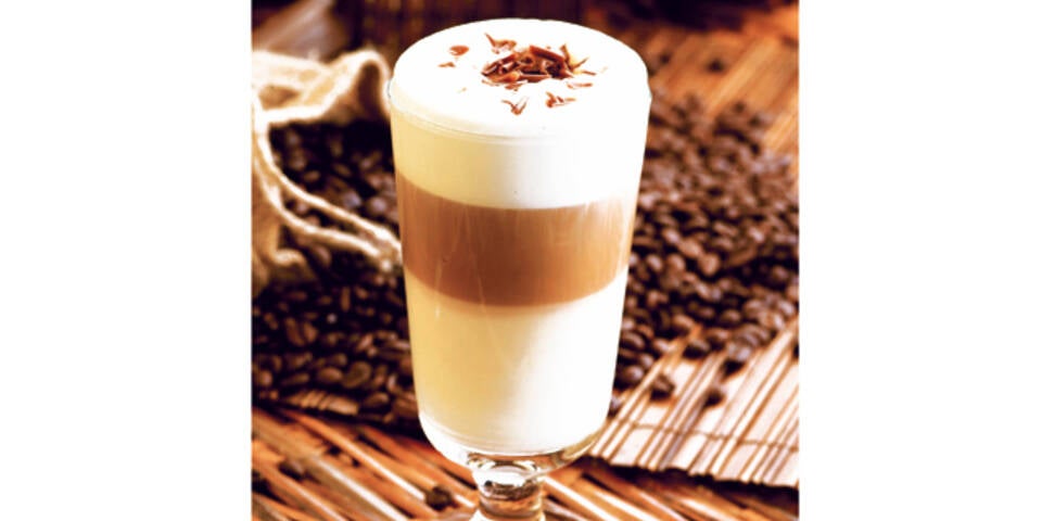 Als ersten Schritt die Milch in ein Glas füllen und warten bis sich der Schaum absetzt. Nun vorsichtig den Kaffee eingießen. Mit einem Messer Raspeln aus der Schokolade schaben & drüberstreuen.