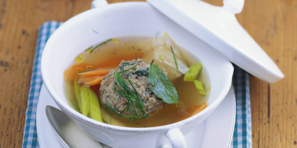 - Karotte, Sellerie und Lauch waschen und schälen bzw. putzen und in feine Scheiben bzw. Ringe schneiden. Den Rinderfond aufkochen lassen, Gemüse und Lorbeer zugeben und ca. 5 Minuten gar ziehen lassen. Auf Suppentassen verteilen und die abgetropften Knödel hinein legen.