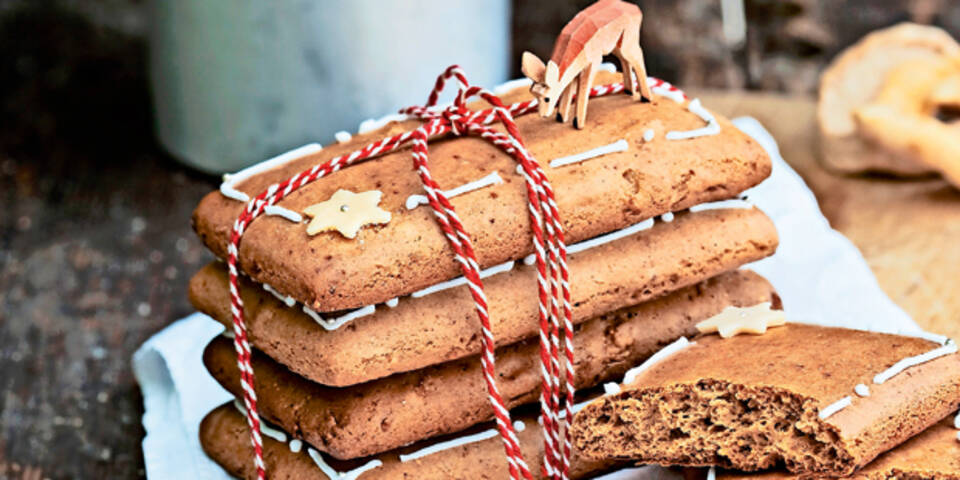5. Für die Dekoration den Puderzucker mit dem Zitronensaft und wenig Wasser zu einem dickflüssigen Guss verrühren. Den Guss in einen kleinen Spritzbeutel füllen (ggf. aus Pergament eine Spitztüte drehen) und die Lebkuchen mit einer Linie aus Puderzuckerglasur verzieren. Auf einer Ecke je einen Schokostern aufkleben. Den Guss gut trocknen lassen.