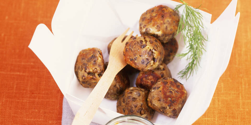 - Schalotte und Knoblauch schälen und würfeln. In 1 EL heißem Öl anschwitzen und zu den Linsen geben. Ei, Thymian, Salz und Pfeffer zugeben und zu einer gut formbaren Masse vermischen. Nach Bedarf Semmelbrösel zugeben. 20 Minuten ziehen lassen. Dann mit feuchten Händen daraus etwa 20 kleine Bällchen formen. In einer heißen Pfanne im restlichen Öl ca. 5 Minuten rundherum goldbraun braten.