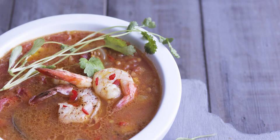 - Die Garnelen abbrausen und trocken tupfen. Mit dem Limettensaft beträufeln und im restlichen Öl 2–3 Minuten farblos anbraten. Die Suppe auf Schalen verteilen und mit den Garnelen sowie den Kräutern garniert servieren.
