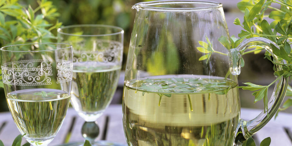 - Waldmeister abbrausen und gut abtropfen lassen. Die Stängel zu einem Sträußchen binden und kopfüber hängend etwa 1 Stunde antrocknen lassen. Anschließend mit dem Wein übergießen und etwa 20 Minuten ziehen lassen. Die bitteren Stängelenden aus der Flüssigkeit ragen lassen.
