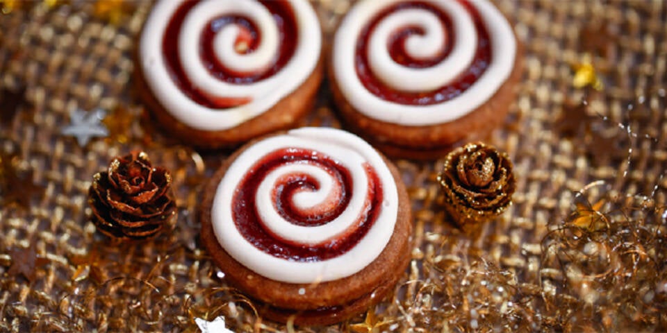 - Jeweils 2 Kekse mit Ribiselmarmelade zusammensetzen. Die Pastamasse in einen mit feiner Lochtülle bestückten Dressiersack füllen und spiralförmig aufdressieren. Im Backofen bei 140 °C für 5 Minuten trocknen, danach die Zwischenräume mit passierter Ribiselmarmelade auffüllen.