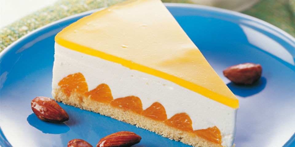 - Mehl versieben und unter die Masse heben, in die Tortenform füllen und im Backofen auf mittlerer Schiene ca. 20 Minuten backen. Aus dem Backofen nehmen und gut auskühlen lassen. Die abgetropften Mandarinenspalten eng nebeneinander auf den Tortenboden legen.