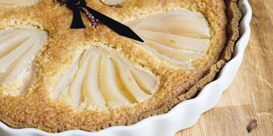 - Für die Mandelcreme Butter, Zucker, Mandeln und Eier cremig schlagen. Die Creme in den Tarteboden gießen. Die geköchelten Birnen halbieren, fächerförmig aufschneiden und auf der Mandelcreme platzieren. Das Ganze 45 Minuten backen.