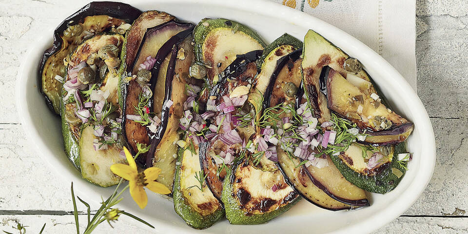 - Zucchini und Melanzani waschen. Melanzani längs halbieren und zusammen mit der Zucchini schräg in ca. 1 cm dicke Scheiben schneiden. Gemüsescheiben im übrigen Öl nach und nach von beiden Seiten bei mittlerer Hitze goldbraun braten. Auf Küchenpapier abtropfen lassen. Dann mit der Marinade in einer flachen Form übergießen und ca. 1 Stunde ziehen lassen.