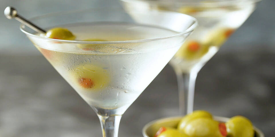 Jeweils 2 Oliven auf einen Cocktailspieß stecken. Die restlichen Oliven in die Gläser verteilen. Den Zitronensaft in die Gläser verteilen und mit Martini auffüllen. Je einen Cocktailspieß in jedes Glas stellen und sofort servieren.