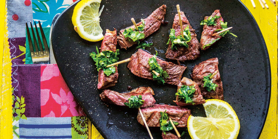 - Im Holzkohlegrill ein Feuer anzünden. Petersilienblättchen von den Stängeln zupfen, fein hacken. Knoblauchzehen schälen, fein würfeln. Beides mit dem Olivenöl mischen.